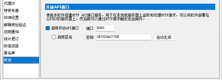 你可以在 选项 -> 其他设置 中看到相关选项,默认端口号 8060。如果你把软件部署在一台有公网IP的服务器上,那所有能访问这台公共服务器的人就都可以调用你的服务了,而不仅限于本机。 如果你是在公网上提供服务,建议启用签名功能,这样可以有效防止非法调用。开放API部署教程