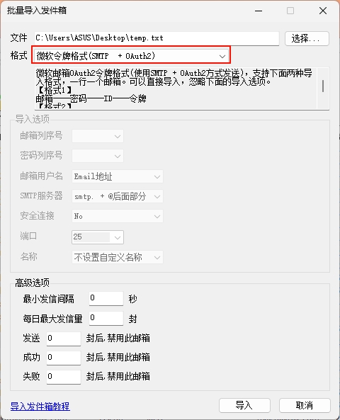按照上面的格式把微软邮箱放到TXT文件,一行一个,在发件箱界面点击导入,或者拖入TXT文件到发件箱界面,然后格式选择下面红框中所示的,点击导入即可。