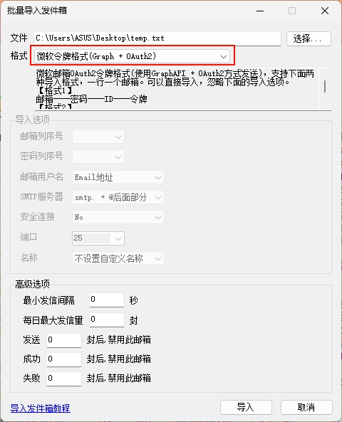 按照上面的格式把微软邮箱放到TXT文件,一行一个,在发件箱界面点击导入,或者拖入TXT文件到发件箱界面,然后格式选择下面红框中所示的,点击导入即可。